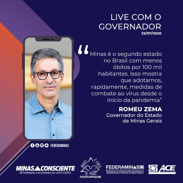 Medidas do Governo para reativar a economia assim que o pico da pandemia do novo coronavírus passar foram o foco da fala do governador de Minas, Romeu Zema, em live recheada de novidades. O bate-papo virtual foi promovido pela Federaminas, nesta quarta-feira (22/07), e coordenado pelo presidente da entidade, Valmir Rodrigues, que fez questão de reafirmar a parceria e apoio ao Governo do Estado nas novas medidas anunciadas.