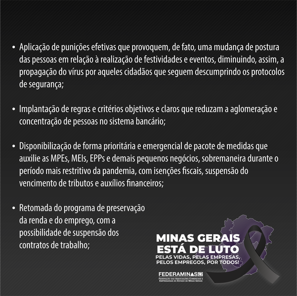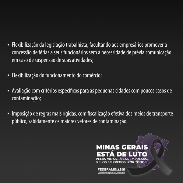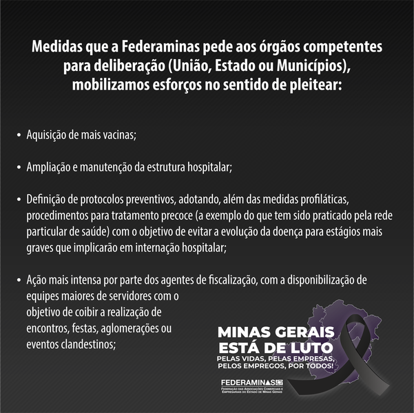 É o momento de ações para garantir o fortalecimento e a conscientização das pessoas. A FEDERAMINAS entende que, simplesmente penalizar setores da economia impondo medidas impeditivas ao exercício de suas atividades sem que lhes seja prestado qualquer auxílio ou socorro de ordem econômica, não trará os resultados necessários para a contenção da pandemia.