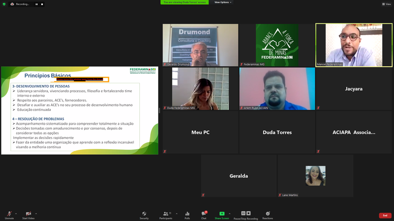 Duda Torres abordou a importância de se fazer uma reestruturação e gerenciamento da comunicação, por meio de um alinhamento dos grupos de Whatsapp à proposta do Projeto Conectividade, compartilhando, de forma ágil, informações pertinentes, boas práticas, apoio a dúvidas das ACEs, agendas de reuniões, sugestões de temas, capacitações, visando fortalecer a comunicação mais assertiva entre a Federaminas e Associações. Para nos conectar e gerar maior produtividade, a proposta é a migração dos grupos existentes, por meio de um link, para um novo grupo gerenciado pela Federaminas. A ideia é colocar regras de postagem para melhor aproveitamento de todos, com temas ligados ao Associativismo.