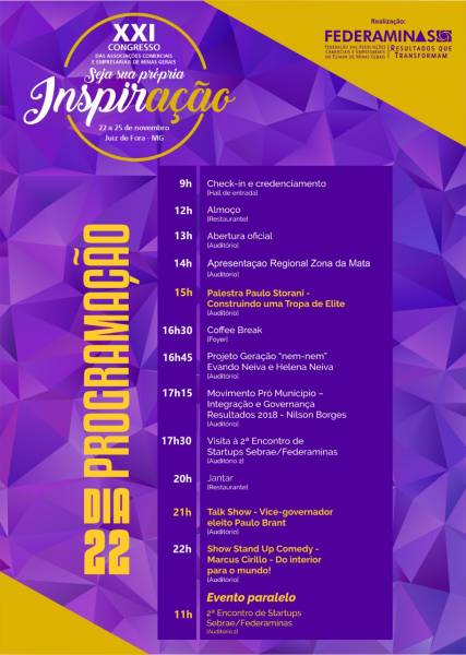 Confira no quadro abaixo a programação completa do primeiro dia do congresso da Federaminas.