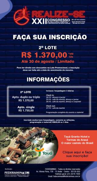 Entre os dias 24 e 27 de outubro, a Federaminas – entidade sem fins lucrativos que atua há 65 anos promovendo o desenvolvimento do empresariado mineiro, com sustentabilidade e valorização do associativismo – realizará no Grande Hotel de Araxá, o “XXII Congresso das Associações Comerciais e Empresariais de Minas Gerais”.